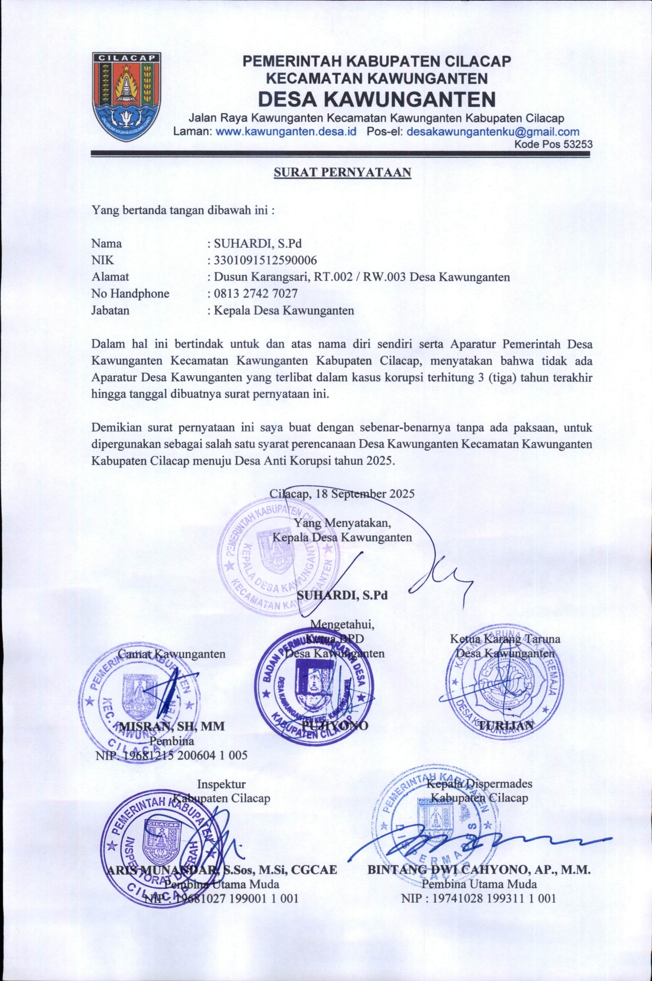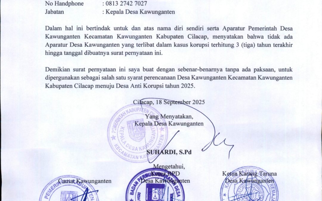 Dalam upaya mewujudkan tata kelola pemerintahan yang bersih, transparan, dan akuntabel, Kepala Desa Kawunganten secara resmi menandatangani Surat Pernyataan Tidak Terlibat Kasus Korupsi. Langkah ini menjadi bukti nyata komitmen Pemerintah Desa Kawunganten dalam mendukung gerakan nasional pemberantasan korupsi di tingkat desa.